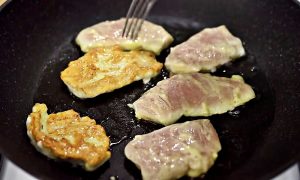 Pokračujte tím, že marinované maso zaprášíte hladkou moukou, kterou opět s masem dobře promíchejte. V pánvi zahřejte pár kapek rostlinného oleje a vyskládejte na něj první várku masa. Není třeba jej opékat dlouho, protože maso je velmi tenké. Jakmile budou řízečky z obou stran mírně zlatavé, sejměte je z pánve a podávejte.