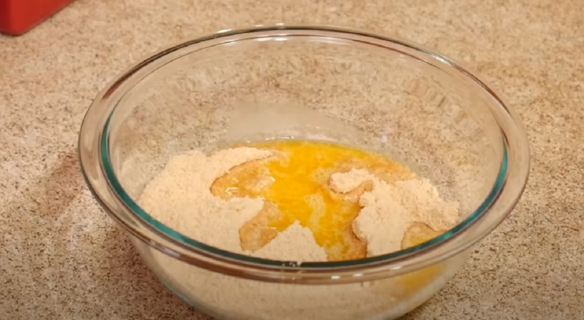 Začněte tím, že si v mixéru rozdrtíte najemno máslové sušenky. Poté je přemístěte do misky a promíchejte spolu s cukrem a rozpuštěným máslem.