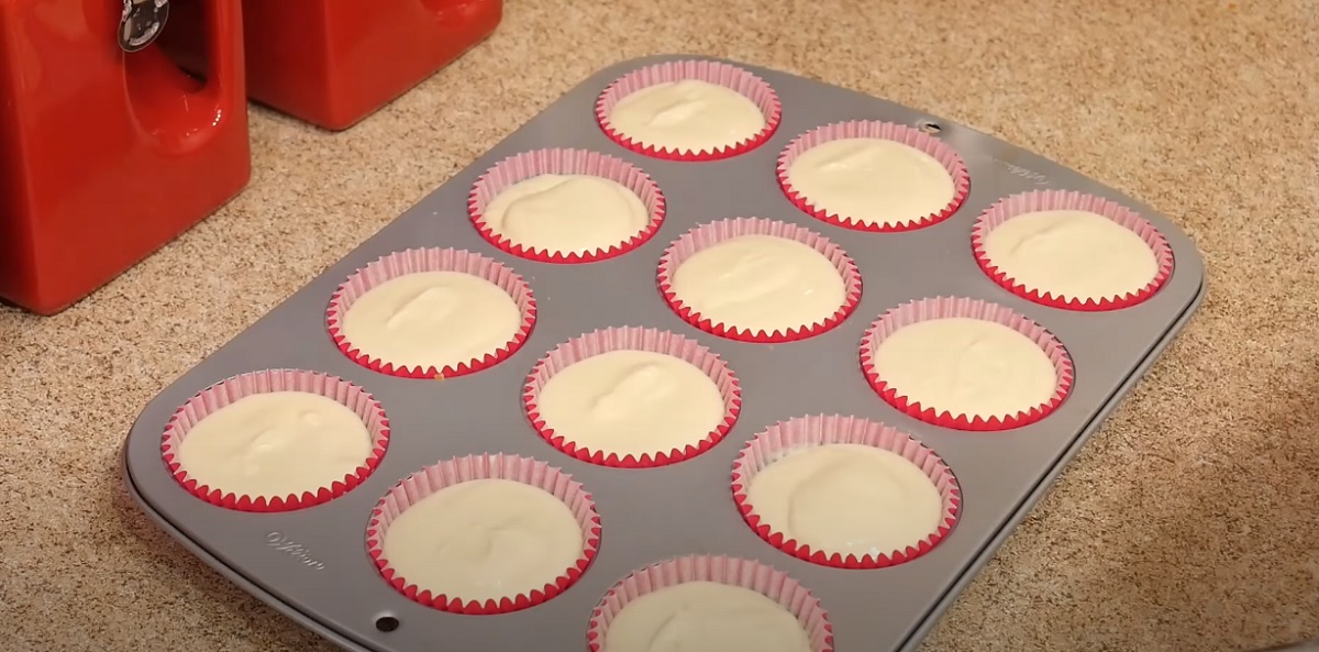 Výsledný krém nalijte na sušenkový korpus, abyste zcela naplnili papírové košíčky.