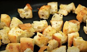 Veku nebo bagetu nakrájejte na menší kostičky, vhoďte je na pánev, posypejte solí a česnekovým práškem, zakapejte olivový olejem a za občasného míchání je osmahněte ze všech stran dozlatova, což bude trvat kolem 5 až 7 minut.