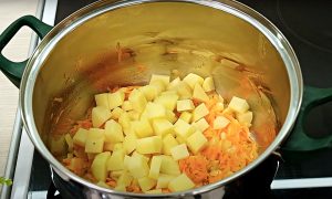 Oloupejte brambory a nakrájejte je na drobné kostičky, které vsypte k orestované cibuli a mrkvi. Promíchejte a všechny tři druhy zeleniny společně 5 minut opékejte.