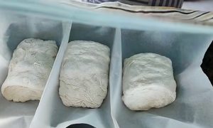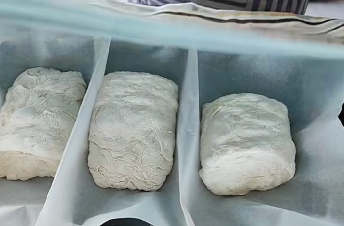 Plech vyložte velkým kusem pečicího papíru a položte na něj tři budoucí ciabatty. Papír mezi nimi nařaste tak, aby vytvořil přirozenou hranici a pečivo se během kynutí a pečení nespeklo dohromady. Zakryjte je utěrkou a počkejte, dokud nenakynou na 1,5 násobek původní velikosti.