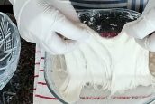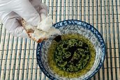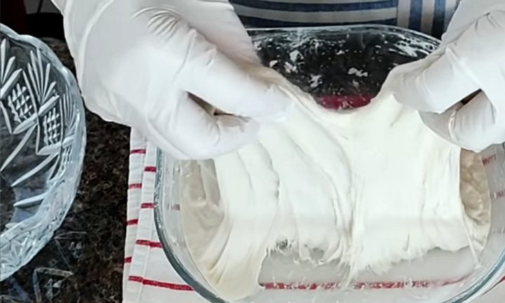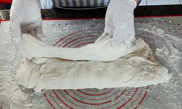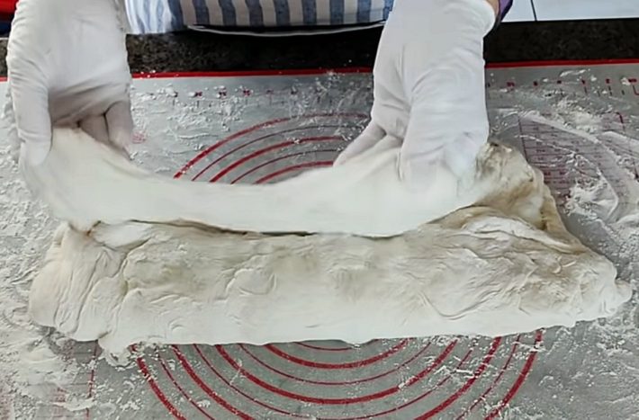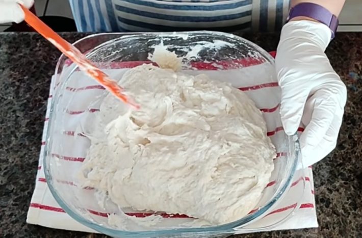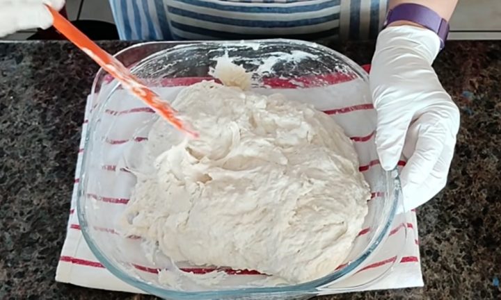 Těsto v míse zakryjte fólií a nechte ho v teple cca 30 minut kynout. Poté si namočte ruce vodou a začněte odlepovat těsto od stěn mísy a okraje překládat přes střed. Překládání opakujte dvakrát dokola ze čtyř stran, poté těsto opět zakryjte fólií a nechte dalších 30 minut kynout.