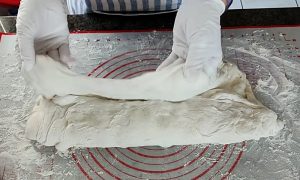 Postup s překládáním od stran do středu znovu zopakujte a nechte opět 30 minut vykynout. Překládání opakujte ještě do třetice a těsto nechte dokynout na dvojnásobný objem, což bude trvat dalších asi 30 nebo 40 minut.