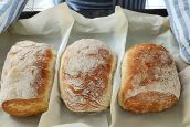 Hotové ciabatty nechte trochu zchladnout, nakrájejte na krajíčky a podávejte třeba namočené do směsi extra panenského olivového oleje smíchaného s kapkou červeného balzamikového octa.