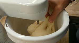 Do misky nalijte teplé mléko, rozdrobte do něho droždí a přidejte jednu polévkovou lžíci cukru. Ihned a bez čekání prosejte přes jemné sítko do hluboké mísy hladkou mouku, přidejte jednu a půl čajové lžičky soli a dobře promíchejte. Přilijte také rozpuštěné droždí s cukrem v teplém mléce a změklé máslo rozkrájené na menší kostky a elektrickým hnětačem či kuchyňským robotem (anebo prostě ručně) uhněťte homogenní, pružné a nelepivé těsto.