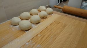 Aniž byste ho nechávali kynout, ihned těsto vyklopte na lehce pomoučněnou pracovní plochu, trochu těsto ručně propracujte a vytvarujte z něho válec. Rozdělte ho na 8 stejně velkých dílů a každý z nich zformujte do tvaru koule. Vyskládejte je vedle sebe, zakryjte je čistou bavlněnou utěrkou a nechte 20 minut stát a kynout.
