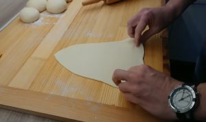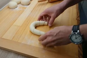 Ten od širší strany stočte do roličky a vytvarujte z ní rohlík. Totéž udělejte se zbylým těstem. Během práce nechávejte zbylé kuličky zakryté utěrkou, aby těsto nevysychalo.