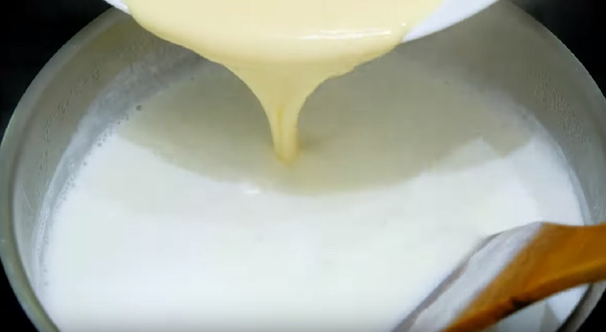 V jiné misce smíchejte zakysanou smetanu se třemi slepičími vajíčky a vyšlehejte obojí elektrickým šlehačem tak, abyste získali homogenní hmotu. Tu pak tenkým pramínkem vlijte za stálého míchání metličkou do kastrůlku s vroucím mlékem.