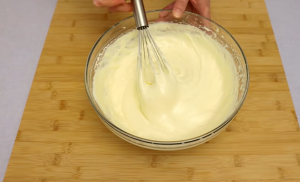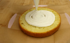Smetanu ke šlehání nalijte do mísy. Opět vezměte mixér a začnete ji šlehat. Pokračujte do dobu, dokud lehce nezhoustne. V tu chvíli do ní přidejte jak moučkový cukr, tak i mascarpone. Pokračujte ve šlehání ručním šlehačem, dokud směs výrazně nezhoustne. Naplňte polevou cukrářský pytlík a můžete ji nanést na první vrstvu těsta, kterou jste před tím lehce potřeli sirupem – vodou smíchanou s cukrem.