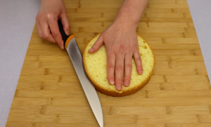 Vezměte formu, ideálně kulatou o průměru kolem 20 centimetrů. Do této formy nalijte veškeré těsto. Rozetřete ho až k okrajům a formou několikrát zahrkejte. Tím se těsto dostane do všech škvír. Poté si rozehřejte troubu na teplotu 180 stupňů a těsto do ní vložte. Pečte ho po dobu asi 30 minut. Po vyjmutí formu otevřete a těsto vyklopte. Vezměte nůž a po vychladnutí ho rozřízněte podílně na třetiny.