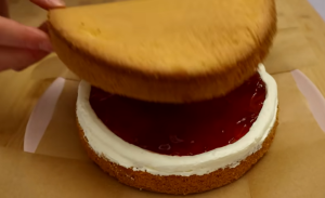 Pomocí krému vytvořte vyšší hranu a následně do vytvořeného prostoru naneste marmeládu. Buď lžící, nebo pomocí cukrářského sáčku. Přiklopte horním kusem upečeného těsta a opět naneste krém, veškerý, který vám zbyl. Tím potřete i boky koláče. Zbývající kus těsta rozdrobte a dejte do mixéru. Použijte ho jako alternativní drobenku ke zdobení. Tímto je unikátní krémový dort s marmeládou hotov.