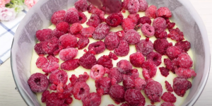 Klasickou kulatou dortovou formu vyložte pečicím papírem a přelijte do ní veškeré těsto. Zajistěte, aby se dostalo až do krajů a na povrchu bylo rovnoměrně rozetřeno. Následně použijte maliny, nebo jiné ovoce. Může být jak čerstvé, tak se hodí i mražené. V takovém případě ho není nutné před použitím rozmrazovat. Ovoce poklaďte rovnoměrně na těsto do formy.