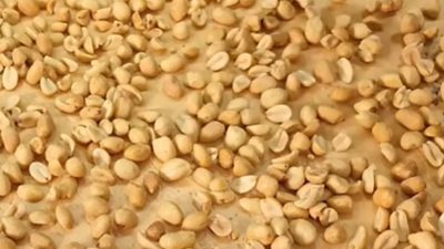 Čtvrtinu krému aplikujte na první dva korpusy, posypte ho arašídy, ty potřete druhou čtvrtinou krému a zakryjte zbylými dvěma korpusy.