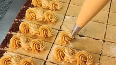 První dva korpusy položte vedle sebe na rovnou plochu a pokračujte s přípravou krému. Změklé máslo šlehejte 1–2 minuty, poté do něj vešlehejte zkaramelizované kondenzované mléko a krémem naplňte cukrářský sáček.