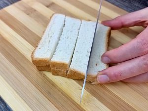 Krajíce toustového chleba rozdělte podélně na čtvrtinky. Použijte vždy dva a dva krajíce, které krájejte přeložené na sobě.