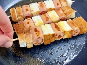 Na sporáku rozehřejte pánev vymazanou trochou másla a opečte na ní párky s chlebem na špejlích ze všech stran dozlatova.