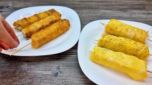 Vyklepněte do misky vajíčko, jemně ho osolte a rozšlehejte. Nalijte vajíčko na pánev, a když začne tuhnout, nabalte jej na tyčku z chlebu a párku. Spoj nechte chvilku zapéct a odložte na talíř. Tímto způsobem zpracujte druhou polovinu špízů a podávejte.