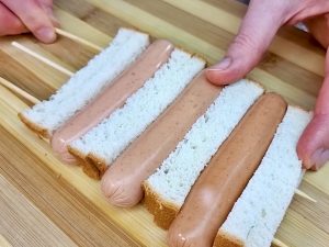 Dvojité čtvrtiny chleba položte na pracovní plochu a umístěte mezi ně tři nožičky krátkých párků. Sestavu pak zajistěte propíchnutím třemi párátky. Seřízněte okraje párků a rozkrojte sestavu podél párátek na dlouhé špízy. Stejným způsobem zpracujte i druhé dva plátky chleba a trojici párků.