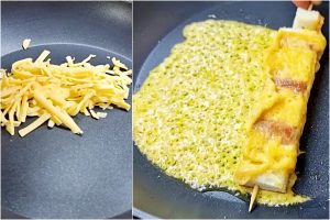 Nastrouhejte sýr nahrubo a nasypejte ho na dno čisté a suché pánve. Nechte sýr, aby se roztavil a slil se do jednolité vrstvy. Vezměte opečenou chlebovo-párkovou tyčinku a namotejte na ni roztavený sýrový plátek. Tímto způsobem zpracujte polovinu párkových tyčinek.