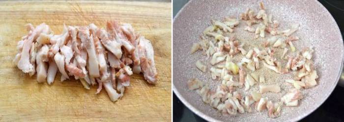 Ten můžete předtím trošku podrtit boční stěnou nože a přisolit. Slaninu s česnekem smažte asi pět minut.