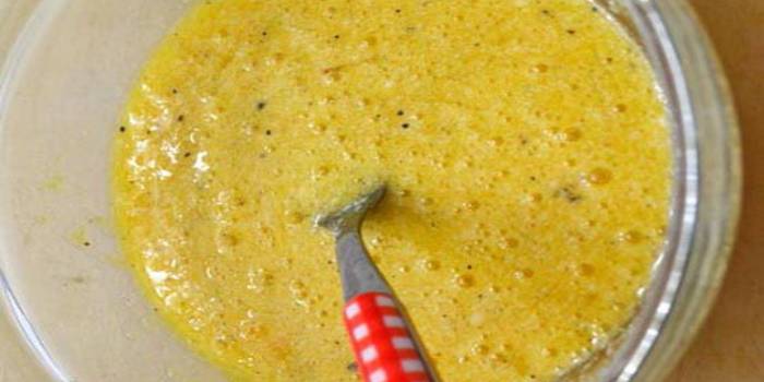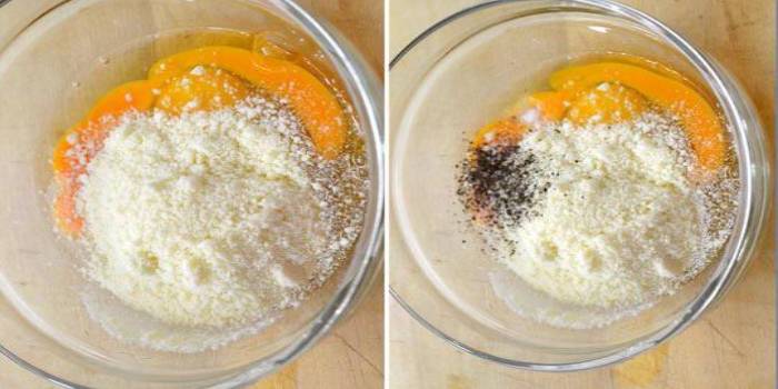 Do vyšlehaných vajec přidejte sůl a pepř, případně čerstvé bylinky, pokud zrovna máte nějaké po ruce. Nakonec ve vejcích rozmíchejte sýr, ale trochu si ho nechte stranou na posypání.