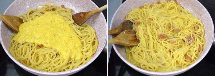 Do pánve s těstovinami přilejte směs vajec a sýra. Celou směs dobře promíchejte a pánev odstavte z plotny. Aby byla omáčka carbonara opravdu dokonalá, přidejte do ní několik polévkových lžic vody, ve které jste vařili špagety. Těstoviny carbonara se obvykle servírují jako předkrm, nikoli jako hlavní chod, a mají povzbudit chuť k jídlu.