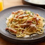 Uzená kuřecí prsa si pokrájejte na menší kousky a osmažte je po dobu čtyř minut na olivovém oleji. Pak přidejte jemně pokrájenou cibuli a promíchejte. Asi po dvou minutách vložte k masové směsi kousky loupaných rajčat, osolte, opepřete a vařte pět minut. Uvařené špagety al dente promíchejte nakonec se směsí a ihned podávejte. Dobrou chuť.