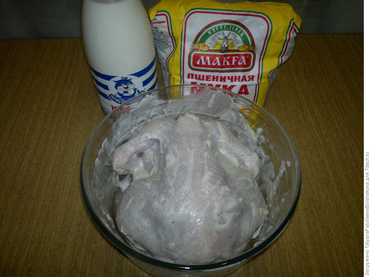 V misce smíchejte dvě nebo tři polévkové lžíce majonézy s čtyři nebo pěti rozdrcenými stroužky česneku a dobře směs prošlehejte vidličkou. Připravené a očištěné kuře vložte do mísy vhodné velikosti a celý jeho povrch potřete majonézovou směsí, abyste ani kousek nevynechali. Pak kuře v míse vložte do lednice, kde ho nechte zhruba hodinu či hodinu a půl chladit a marinovat.