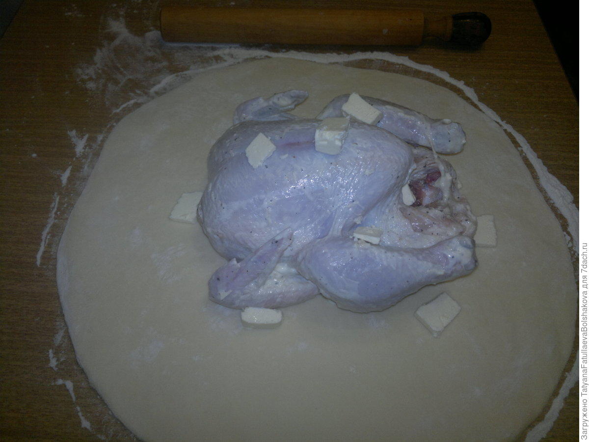 Odpočaté těsto pak vyklopte na pomoučněnou pracovní plochu a vyválejte z něj velkou kulatou placku. Do jejího středu položte kuře. Máslo pokrájejte na několik menších kousků, které rozmístěte na kuře a do něj.