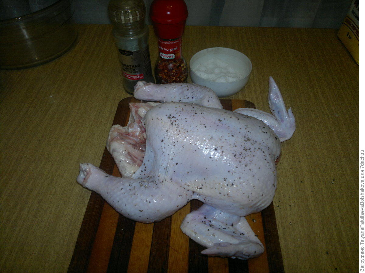 Kuře dobře umyjte zvenčí i zevnitř, osušte ho papírovými utěrkami a případně pinzetou dočistěte zbytky peří. Ze všech stran i zevnitř pak posypejte kuře solí a pepřem a obojí do masa jemně vetřete.