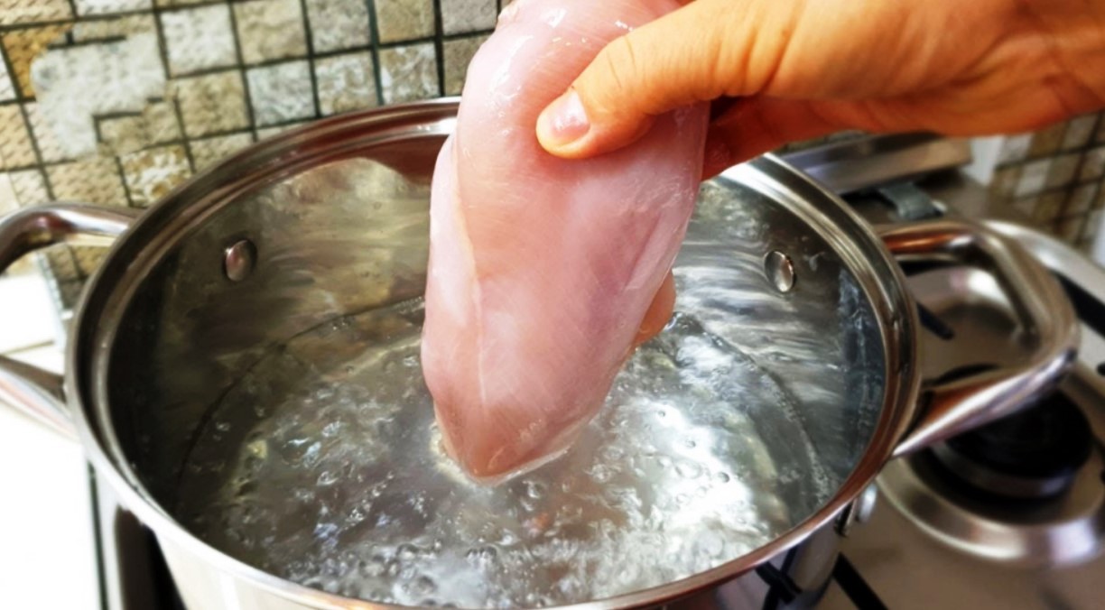 Kuřecí prsíčka důkladně umyjte, vložte je do hrnce s osolenou vodou, přiveďte k varu a vařte, dokud nebude maso hotové.