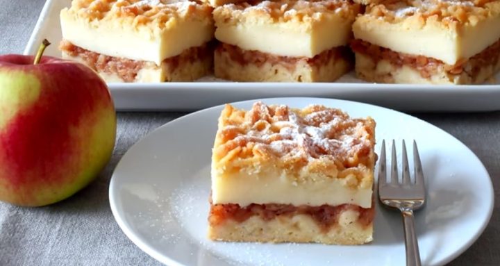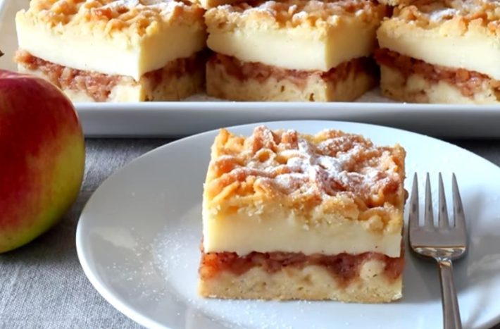 Pokud máte doma pár jablek, přetvořte je ve vynikající strouhaný koláč. Sladkost ovoce si výborně rozumí s jemností pudinkového krému.