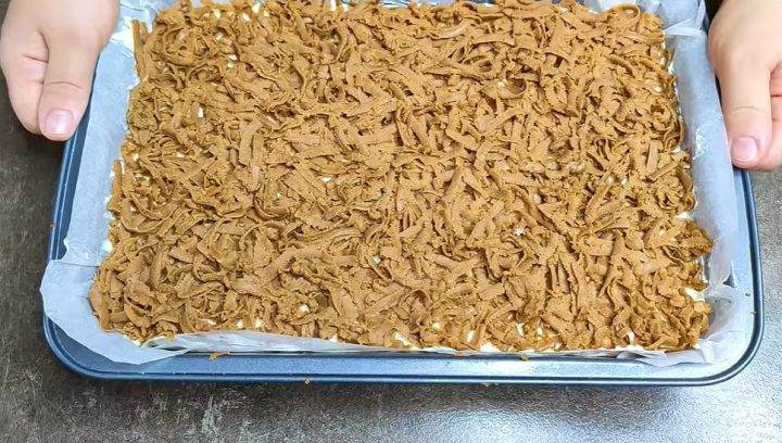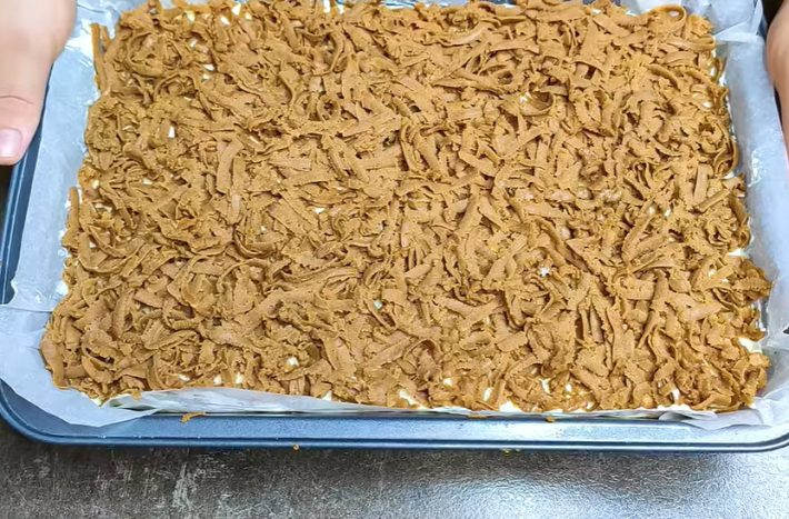 Plech vyložte pečicím papírem a nastrouhejte na něj první polovinu těsta. Rovnoměrně ji rozprostřete, naneste náplň a na vrch nastrouhejte druhou polovinu těsta. Vložte do trouby předehřáté na 160 stupňů péct na cca 60 minut. Po vytažení můžete koláč posypat strouhaným kokosem na ozdobu, nechejte jej vychladit v lednici a můžete servírovat. Dobrou chuť!