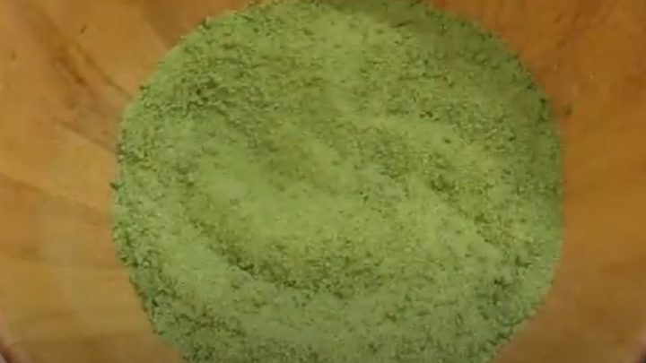 Směs rozprostřete do sušičky na ovoce, vyložené pečicím papírem a sušte ji při 50–70 °C přibližně 3 hodiny. Usušenou sůl rozmělněte pomocí lžíce a skladujte ji ve vzduchotěsné nádobě na suchém a chladném místě.