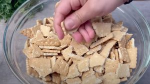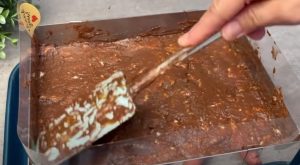 Směs vlijte do mísy s rozlámanými sušenkami a pečlivě promíchejte tak, aby se všechny kousky sušenek obalily čokoládou. Plech či formu o rozměrech 24×20 centimetrů vyložte acetátovou folií. Sušenkovou směs dejte na dno a co nejvíce ji umačkejte a uhlaďte do rovného povrchu. Dejte ji poté na chvíli do lednice ztuhnout.