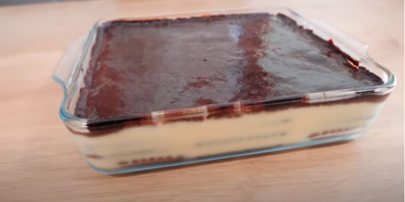 Dno skleněného pekáče s vyššími okraji vyložte sušenkami a na ně nalijte část krému tak, aby byly překryté. Na něj opět rozložte sušenky a zalijte je krémem. Tak pokračujte v tolika vrstvách, kolik máte k dispozici, záleží na velikost pekáče. Poslední, horní vrstvu by měl tvořit krém.