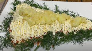 Nastrouhejte nahrubo mrkev a rozložte ji nahoru. Kolem trojúhelníku položte snítky kopru, budou vypadat jako větvičky stromku. Na mrkev udělejte síťku z majonézy. Nastrouhejte vejce na hrubém struhadle, rozložte je na mrkev a opět udělejte síťku. Nastrouhejte jablka, rozložte je na majonézu a pokračujte opět vrstvou majonézy. Nastrouhejte sýr a rozložte ho nahoru.