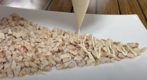 Uvařte si kuřecí prsa ve slané vodě a nechte je v ní vychladnout, budou tak šťavnatá. Uvařte vajíčka natvrdo a mrkev doměkka. Poté nakrájejte kuřecí prsa na kostičky, opepřete je a přidejte sladkou papriku. Poté je dejte na podlouhlý talíř a vytvarujte je do tvaru podlouhlého trojúhelníku. Pak na nich udělejte síťku z majonézy, kterou jste předtím dali do cukrářského sáčku.
