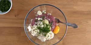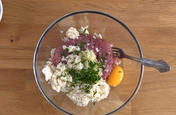 Nejdříve připravte masové kuličky. Chléb namočte do mléka a rozmačkejte vidličkou. Cibuli a česnek nakrájejte nadrobno a orestujte na pánvi s trochou oleje nebo másla. Petrželku nasekejte nadrobno. Maso vložte do mísy, ochuťte solí, pepřem a muškátovým oříškem. Přidejte vejce, cibuli, česnek, chléb a petrželku. Promíchejte. Zakryjte potravinářskou fólií a dejte na 30 minut do lednice.