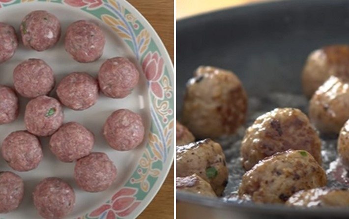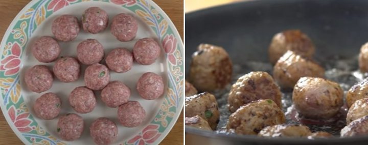 Navlhčete si ruce vodou a z mletého masa vytvarujte kuličky. Měli byste získat asi 35 masových kuliček. Do pánve dejte trochu rostlinného oleje a opékejte kuličky 4-5 minut z každé strany do zlatova.