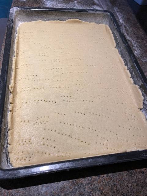 Do jiné misky nasypejte hladkou mouku, přidejte cukr a prášek do pečiva a dobře promíchejte. Pak do směsi sypkých surovin vyklepněte jedno vajíčko, přidejte změklé máslo pokojové teploty a také jeden decilitr mléka a zadělejte homogenní těsto. To rozdělte na dvě části a rozválejte je na dva pláty o velikosti plechu na pečení.