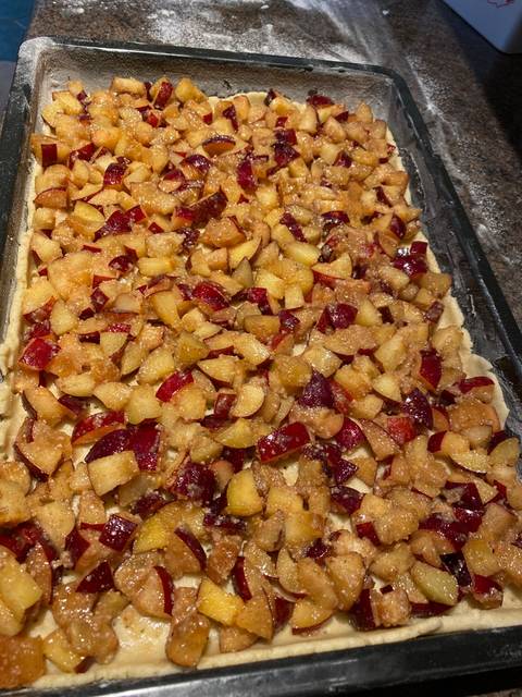 Plech vytřete máslem, případně jej vyložte pečicím papírem a rozprostřete do něho jeden plát těsta. Vidličkou pak po celé ploše tohoto plátu vytvořte spoustu vpichů. Pak na těsto rozprostřete směs ochucených švestek a vyrovnejte je rovnoměrně po celém povrchu.