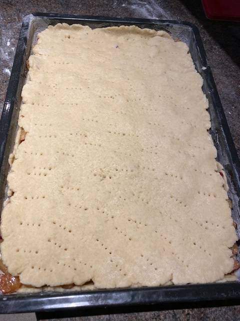Švestky pak nakonec zakryjte druhým plátem těsta, který, stejně jako ten spodní, rozpíchejte vidličkou. To je proto, aby z ovoce mohla unikat horká pára a nesrážela se uvnitř koláče.