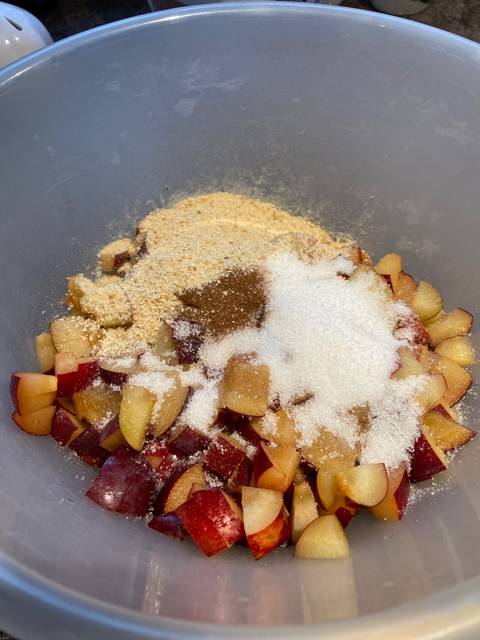 Švestky omyjte a osušte papírovými utěrkami, vyloupněte z nich pecky a nakrájejte dužninu na malé kostky. Ty nasypejte do mísy, přidejte k nim cukr a skořici, jednu nebo dvě polévkové lžíce strouhanky a dvě čajové lžičky škrobu, který do sebe nasaje šťávu z ovoce, která pak nebude narušovat konzistenci těsta. Všechny přísady dobře promíchejte.