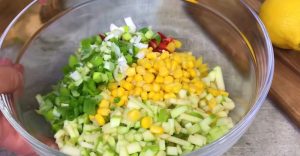Nejprve nadrobno nakrájejte celou kapii a polovinu žluté papriky. Přesypejte do mísy a přidejte i nakrájenou okurku, jablko a jarní cibulku. Dosypejte kukuřici a přilijte vymačkanou citronovou šťávu.