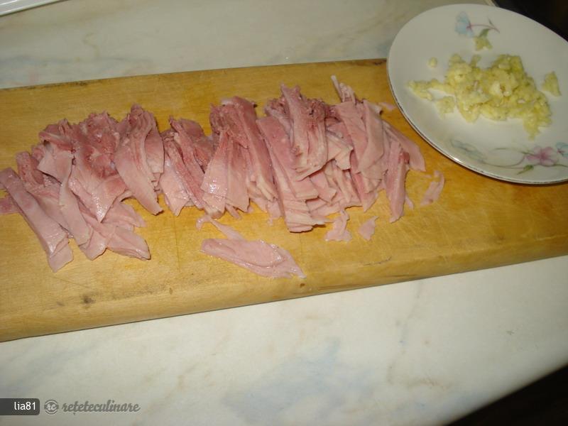 V první řadě byste si měli připravit všechny suroviny, které musíte krájet, protože potom už na to nebudete mít čas. Nakrájejte si šunku na nudličky a česnek nakrájejte najemno nebo ho rozdrťte lisem.