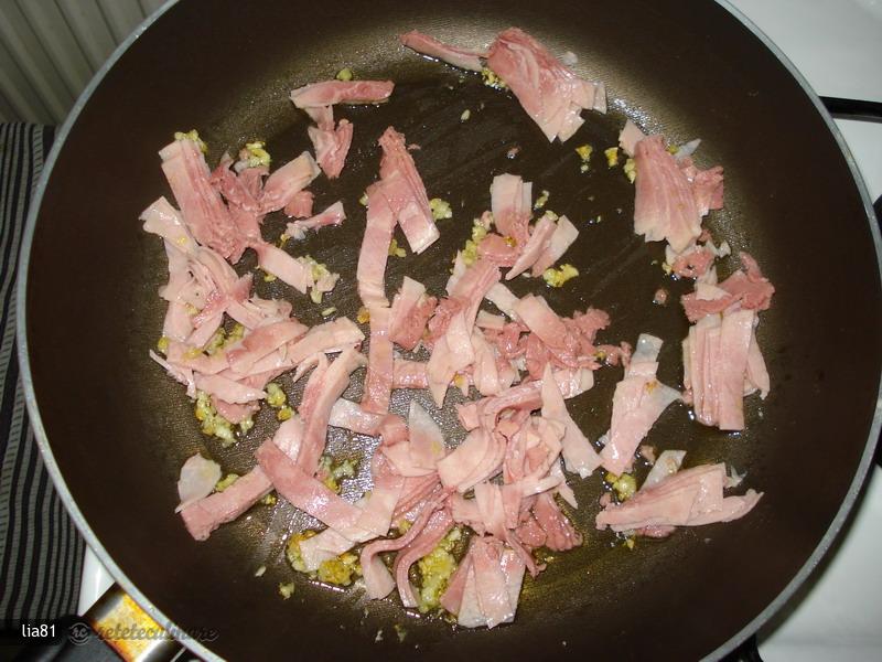 Na pánev dejte trochu oleje a lehce restujte česnek a šunku.