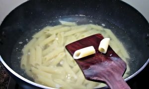 Do hrnce či pánve nalijte vodu a přiveďte ji k varu. Přidejte do ní nejprve lžíci oleje a poté lžičku soli. Když se obojí rozpustí, vsypte také těstoviny. Když voda začne znovu vřít, počítejte 7 minut varu a těstoviny z vody vylovte děrovanou lžící do studené misky.