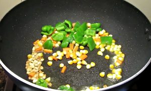 V pánvi rozehřejte trochu rostlinného oleje a přidejte do něj nahrubo nasekaný česnek. Smažte ho, dokud nezačne vonět, a přidejte k němu jemně nasekanou mrkev, papriku a vařenou či konzervovanou kukuřici. Vše společně chvilku restujte a vylovte ven z pánve na talíř.